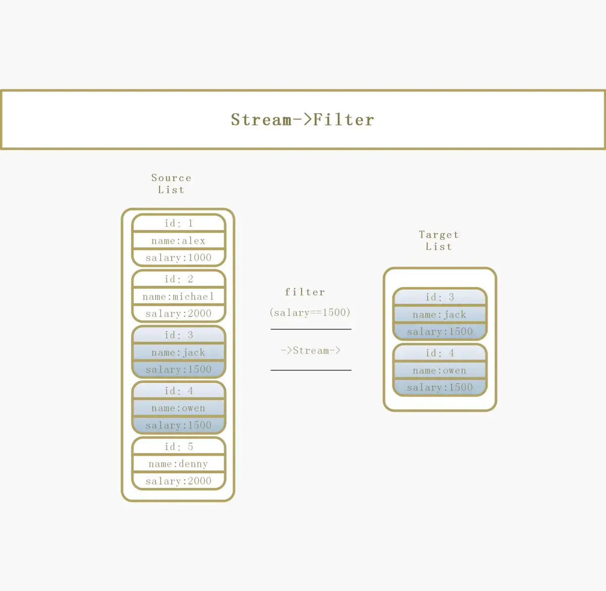 List<Employee> employees1350 = list.stream().filter(employee -> employee.getSalary() == 1500).peek(System.out::println).collect(Collectors.toList());