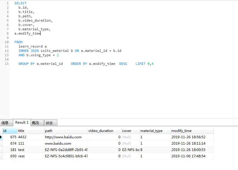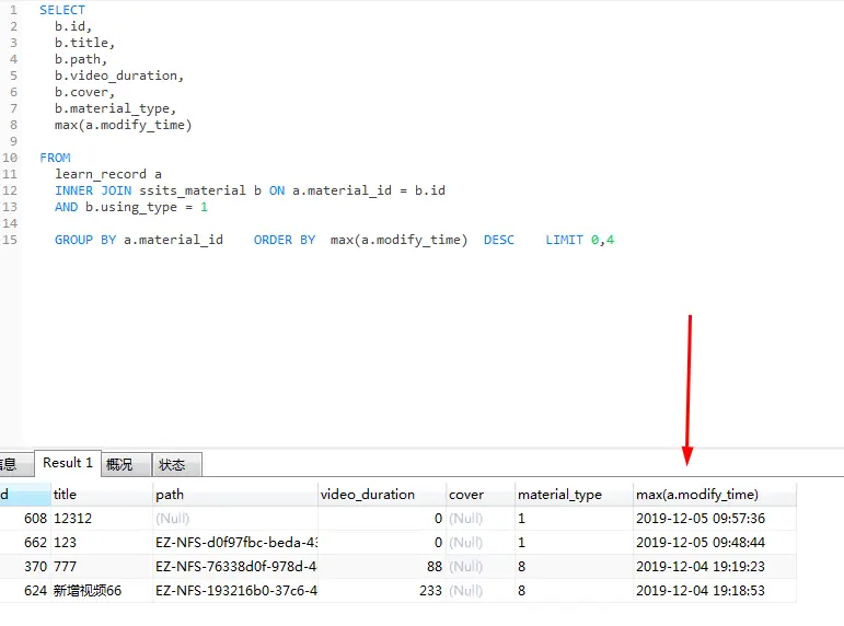 mysql 分组查询最新时间很容易被误导的小细节: 二傻子小文章 2019-12-05 97 阅读1分钟 下面来看这么一跳sql (加入max 获取最大的) 二:不加的时候看: 所以为了获取最大的时间,注意加上max