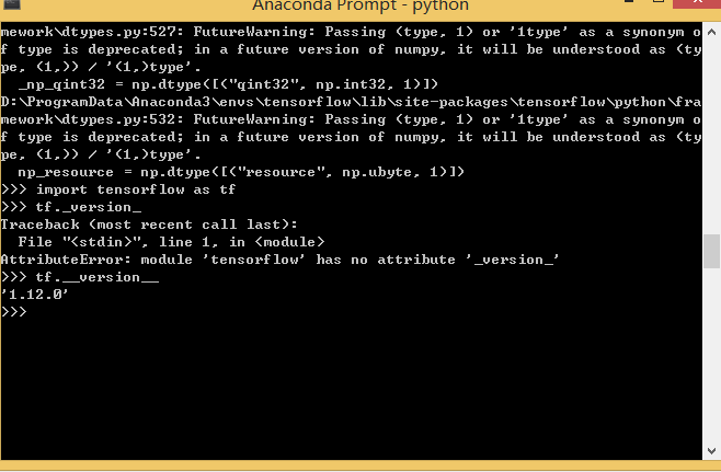查看已安装的tensorflow的版本 田深谋 2019-12-05 193 阅读1分钟 1、激活环境activate tensorflow2、输入python3、输入import tensorflow as tf4、输入tf.__version__注意是两个_