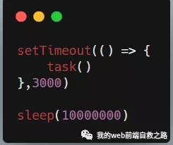 timeout完成,task()进入Event Queue,但是sleep也太慢了吧,还没执行完,只好等着。 sleep终于执行完了,task()终于从Event Queue进入了主线程执行。