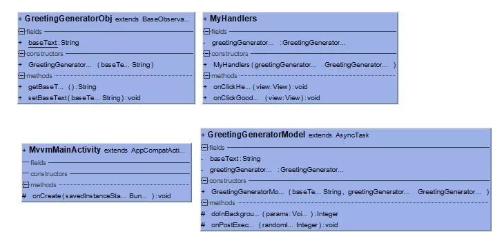在MVVM模式中,本demo有四个类:除了MvvmMainActivity和GreetingGeneratorModel外,新增了GreetingGeneratorObj数据对象类和MyHandlers绑定方法类。