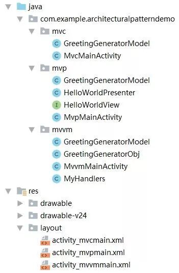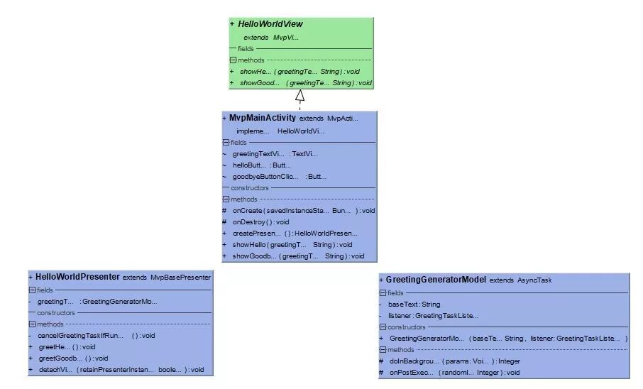 对于MVP模式,本demo有四个类:除了有MvpMainActivity和GreetingGeneratorModel外,新增了HelloWorldView和HelloWorldPresenter。