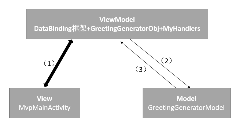 1public class MyHandlers { 2 private GreetingGeneratorObj greetingGeneratorObj; 3 4 public MyHandlers(GreetingGeneratorObj greetingGeneratorObj) { 5 this.greetingGeneratorObj = greetingGeneratorObj; 6 } 7 8 public void onClickHello(View view) { 9 // (2)ViewModel层调用Model层10 new GreetingGeneratorModel("HelloWorld", greetingGeneratorObj).execute();11 }1213 public void onClickGoodbye(View view) {14 // (2)ViewModel层调用Model层15 new GreetingGeneratorModel("GoodBye", greetingGeneratorObj).execute();16 }17}