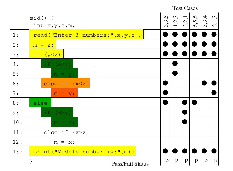 而实际上,考虑到并发、循环、递归等带来的影响,代码执行路径分析会非常复杂。为了保证能够在 Hackathon 那么短的时间内展示出效果,我们又参考了另一篇论文 Visualization of Test Information to Assist Fault Localization,其核心思想是通过统计代码块被正确和错误测试用例经过次数,再基于分析算法来涂上不同的颜色,简单而实用。