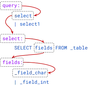 这里我们暂时采用 PingCAP 开源的随机测试框架 go-randgen 实现 SQL fuzzing,它需要用户写一些规则文件来帮助生成随机的 SQL 测试用例。规则文件由一些产生式组成。randgen 每次从 query 开始随机游走一遍产生式,生成一条 SQL,产生一条像下图红线这样的路径。