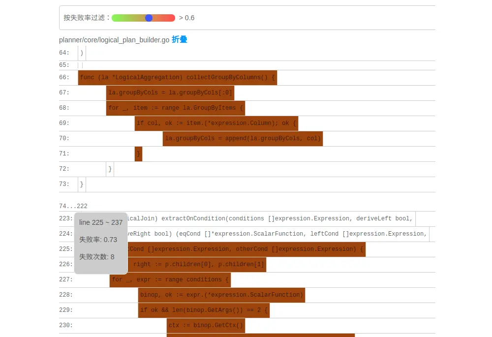 项目的思路其实很简单,如果在每次跑 case 的时候能用统计学的方法对足够多次实验的代码路径进行分析,就可以找出疑似 bug 的代码,最终结果以代码染色的方式由前端可视化呈现,就得到了如下图展示的效果: