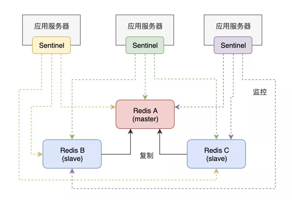 例如一个 master 复制到 N 个 slave,同时运行了多个 sentinel。