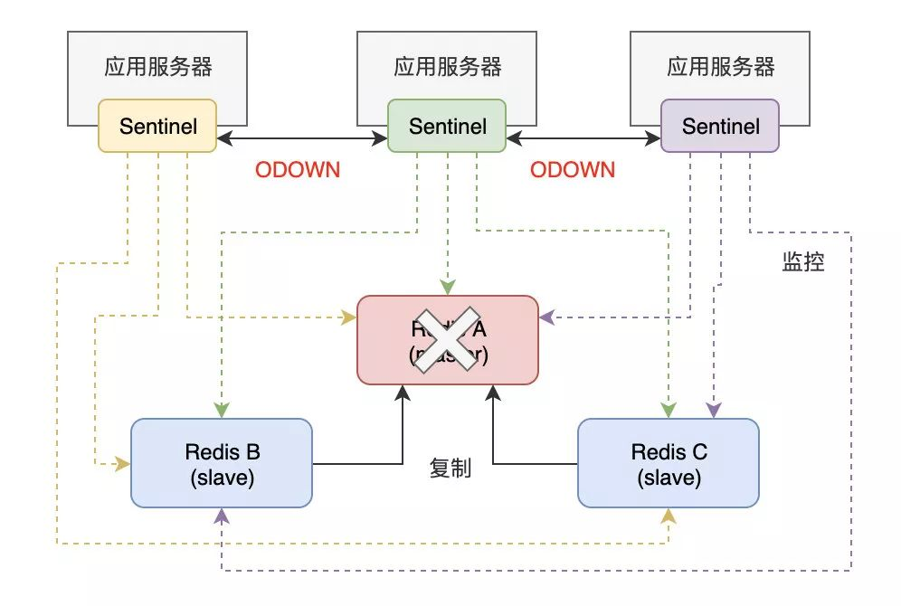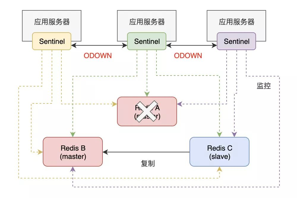 这时,A 宕了,被一个 sentinel 发现了,发出了 SDOWN 消息,之后,其他 sentinel 也发现了,那么 ODOWN 消息被发出。
