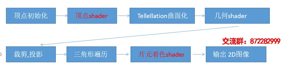Shader 是一种給GPU执行的代码,GPU的渲染流水线,为了方便开发人员定制效果,开放出接口給程序员编写代码来控制,这种程序叫作shader, shader开发语言,cocos采用的是GLSL编程语言。开发人员可以在下图顶点Shader和着色Shader来插入代码。