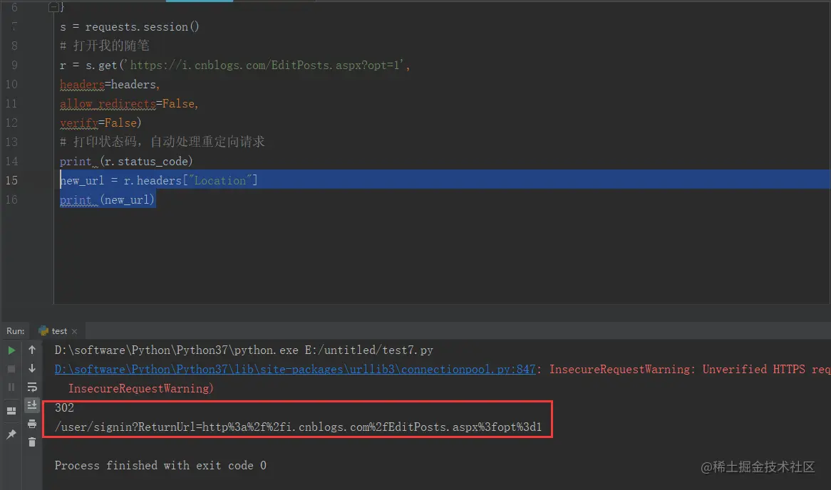 3、自动处理重定向地址后,我们就获取不到重定向后的 url 了,就无法走下一步,这里我们可以设置一个参数禁止重定向:allow_redirects=False(allow_redirects=True 是启动重定向),然后就可以看到 status_code 是 302 了
