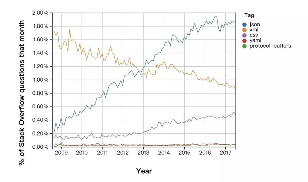 当今的JSON 已经占领了全世界。绝大多数的应用程序彼此通过互联网通信时,都在使用 JSON。它已被所有大型企业所采用:十大最受欢迎的 web API 接口列表中(主要由 Google、Facebook 和 Twitter 提供),仅仅只有一个 API 接口是以 XML 的格式开放数据的。 JSON 也在程序编码级别和文件存储上被广泛采用:在 Stack Overflow上,关于JSON的问题越来越多,下图是关于Stack Overflow上不同数据交换格式的问题数和时间的曲线关系图。3、总结