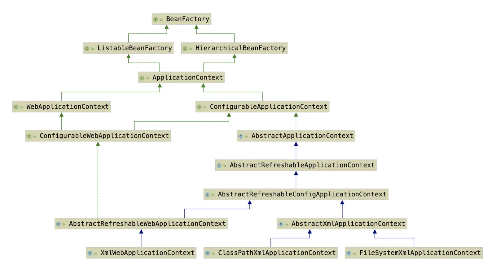 看到这些错综复杂的类关系图,我们不禁感慨,spring的庞大。那么spring为啥要定义这么多接口呢?因为每个接口都有它使用的场合,各个接口之间具有一定的职责,但是又互不干扰,这就是设计模式中的接口隔离原则。你就想一下,如果把这些功能全都在一两个接口实现,那且不是乱成一团糟。