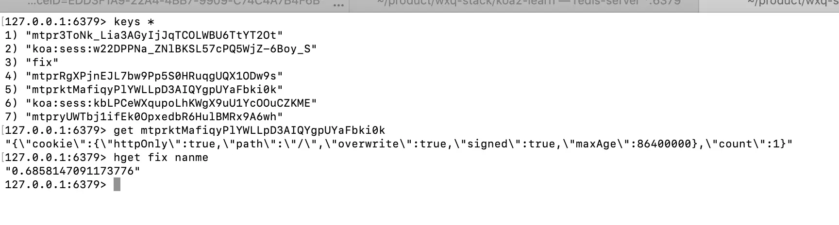 const Redis = require('koa-redis') const Store = new Redis().client; router.get('/fix', async function (ctx) { const st = await Store.hset('fix', 'nanme', Math.random()) ctx.body = { code: 0 } }) # 直接请求即可。因为是get,哈哈哈哈 # url http://localhost:3000/users/fix # 去redis中查询就能看到我们刚才创建的值啦