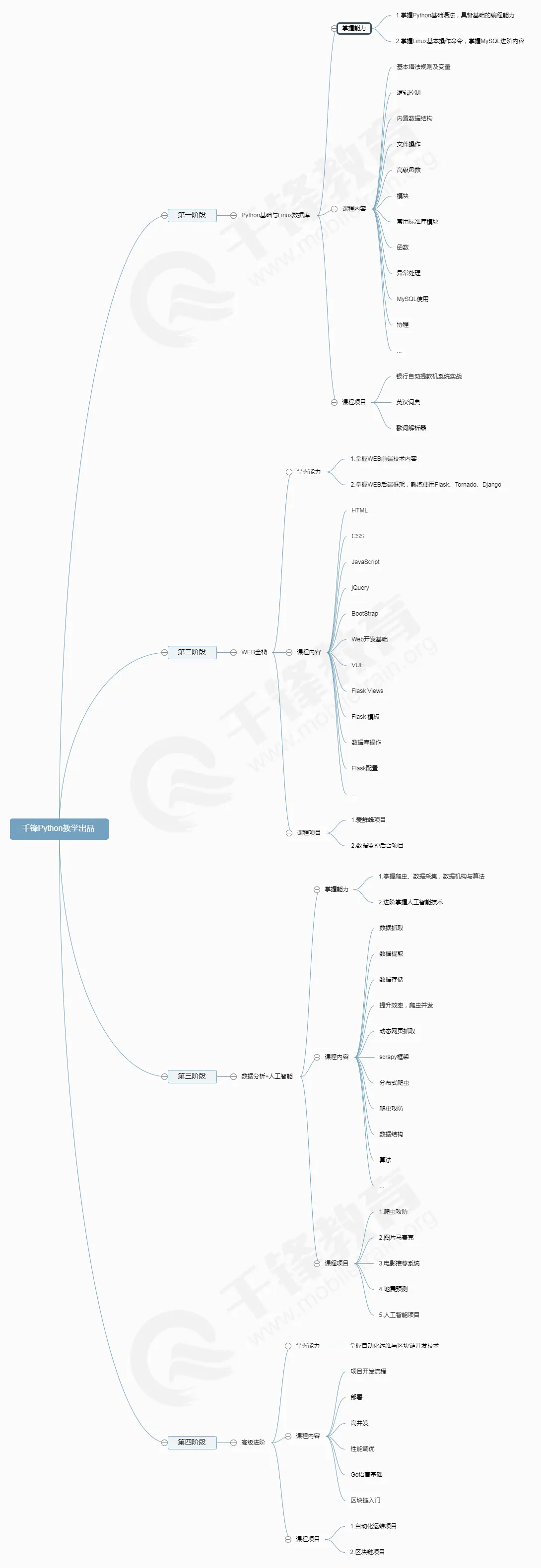 第一阶段Python基础与Linux数据库。这是Python的入门阶段,也是帮助零基础学员打好基础的重要阶段。你需要掌握Python基本语法规则及变量、逻辑控制、内置数据结构、文件操作、高级函数、模块、常用标准库模块、函数、异常处理、MySQL使用、协程等知识点。