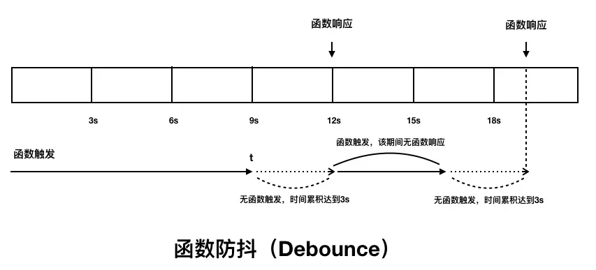 防抖(Debounce)函数: 事件触发停止后开始计时,在固定时间内不再有事件触发,执行事件处理函数A。