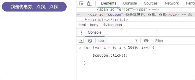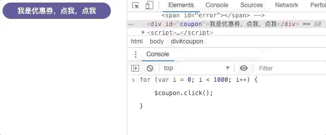 假设一个抢优惠劵的业务场景:用户连续点击优惠劵,每点击一次就会得到一张优惠券,最多10张,总量1000张(有限)。双十一刚过,阿里电商2000多亿的现金流量,想必消费者优惠券都抢的够够的。为了抢到更多优惠券,用户常规操作应该是,手动持续点击。而非常规操作,可能会写一个for循环,把这10张券轻轻松松搞到手。