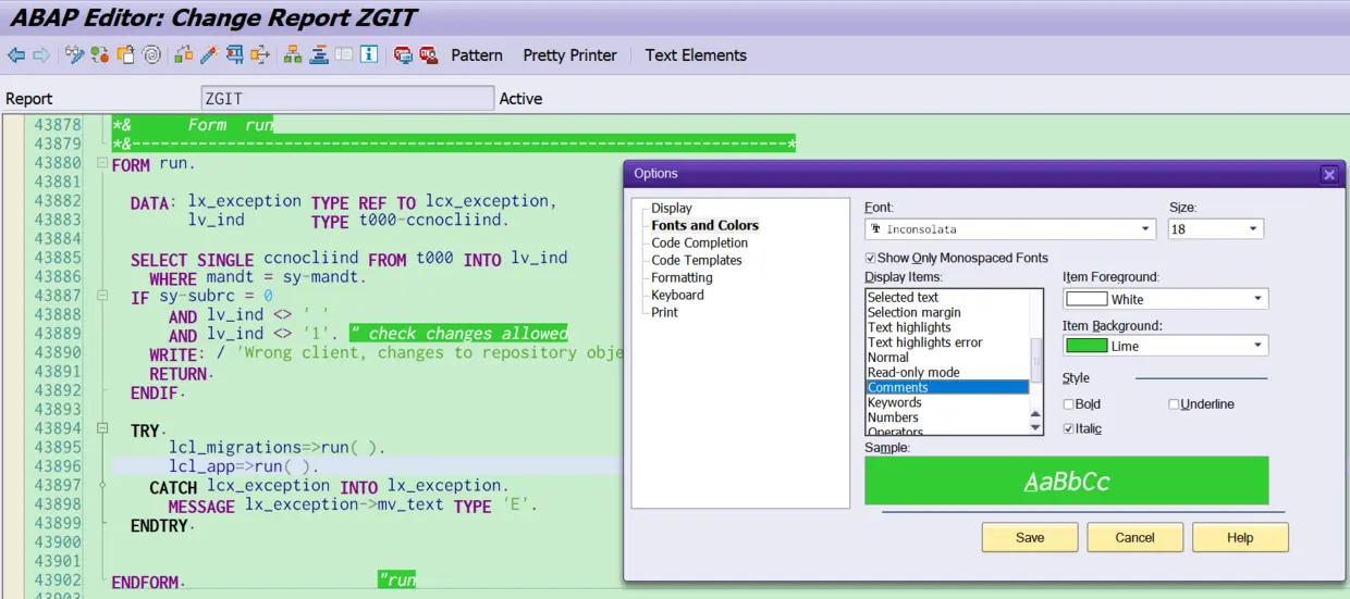 但幸好我们的开发环境还是能够进行各种个性化设置,所以虽然大家都穿着一样的格子衫,但面对的却是色彩各异的开发环境。比如SAPGUI的Options选项,给ABAP开发人员提供了种类丰富的ABAP编辑器UI元素风格的自定义设置,诸如背景色,关键字高亮颜色,注释高亮颜色,断点高亮颜色等等。