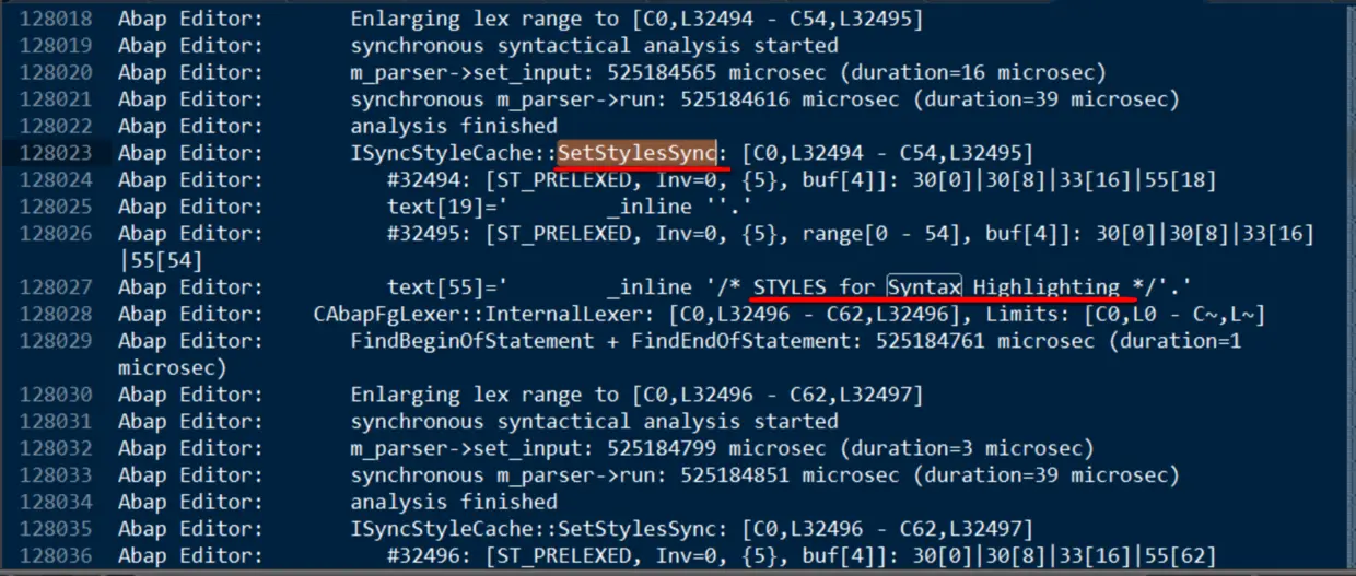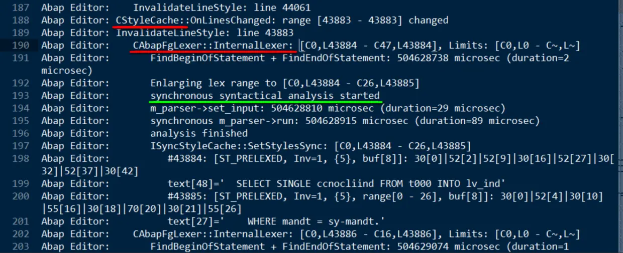 从trace文件不难看出,这个ABAP语句语法分析和语法高亮渲染的同步过程会逐行处理语句,大家平时几乎感觉不到任何时延,是因为编辑的ABAP代码行数较少。