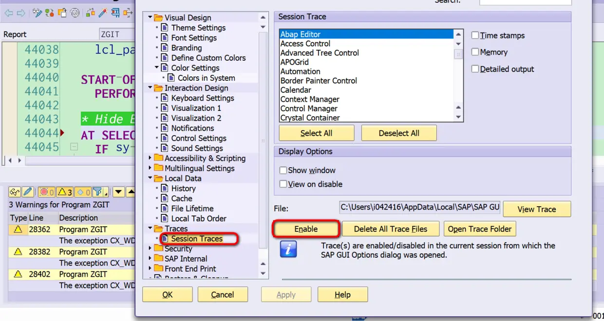 在SAPGUI设置选项里,进入Traces->Session Traces, 点击Enable按钮打开ABAP Editor的trace开关,回到ABAP编辑器,随便做一些操作,比如加一段注释,几个空格,激活代码之类。