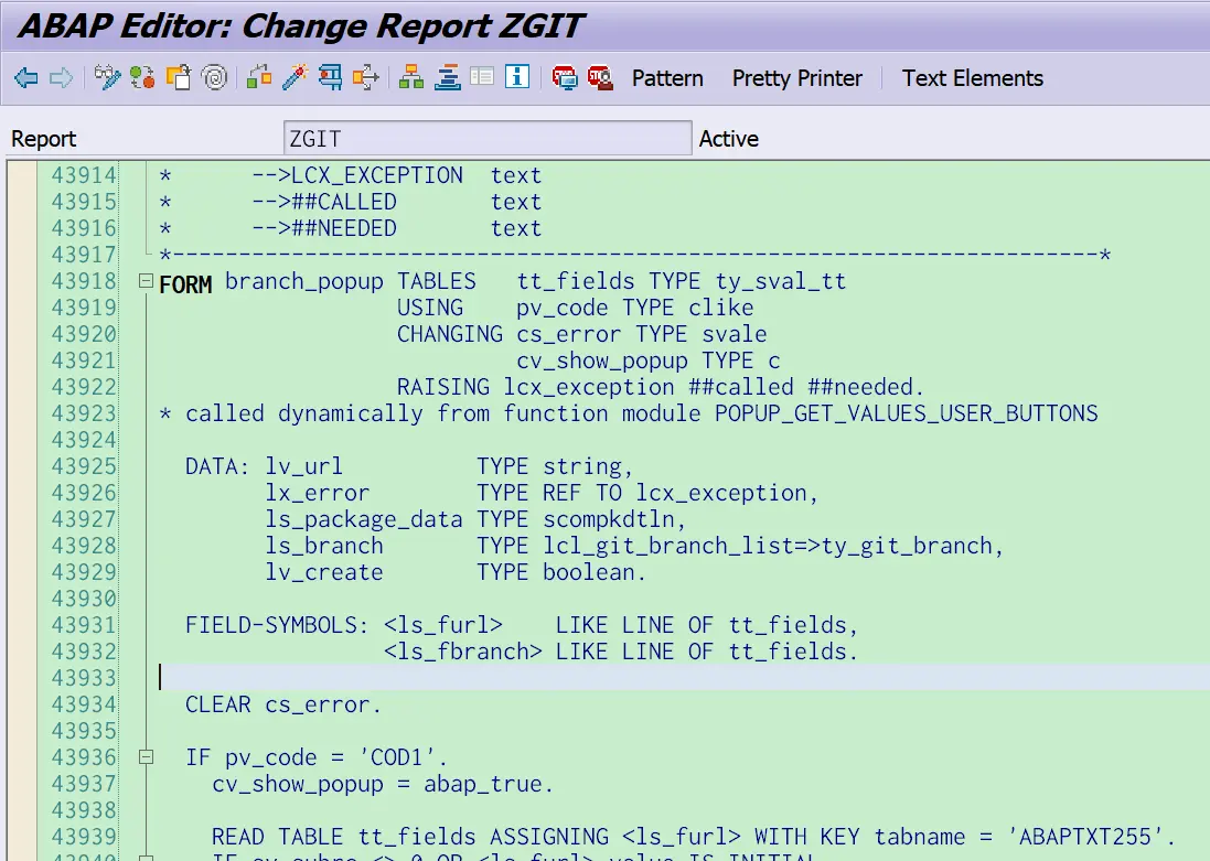 当Jerry在本地编辑ABAP git这个开源项目时,因为report源代码有将近五万行,所以当修改完代码激活之后,会感觉到长达好几秒钟的时延,在这几秒钟内,SAPGUI里的C++实现的编译器在忙碌地进行ABAP语句解析和语法高亮的工作。 在这些工作未完成之间,ABAP编辑器里将不会有语法高亮效果显示: