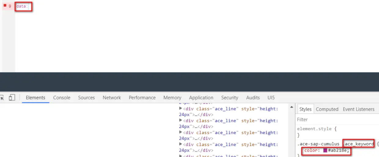 (1) 在浏览器里敲个ABAP的关键字,比如data。发现被高亮显示了。通过Chrome开发工具发现高亮是通过一个叫ace_keyword的css类实现的。