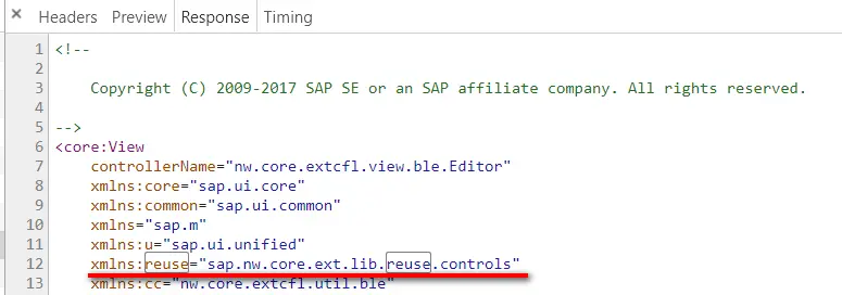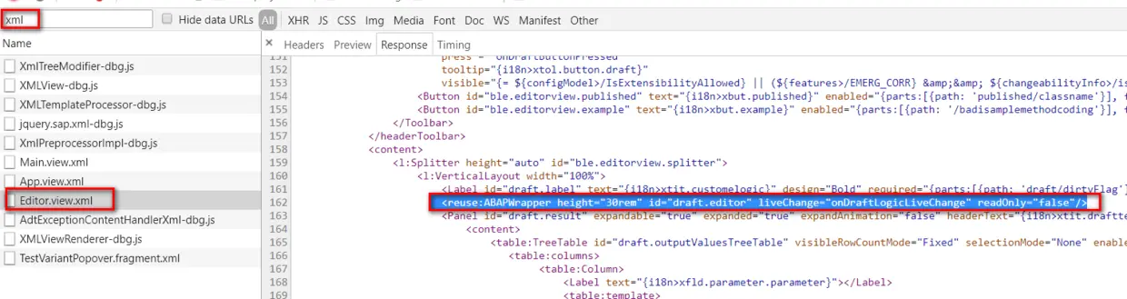 (2) 现在需要找到浏览器里进行ABAP代码编辑的编辑器的实现。在Chrome开发工具里Network tab里输入“.xml”作为过滤条件,于是找到编辑器的Fiori实现: Editor.view.xml