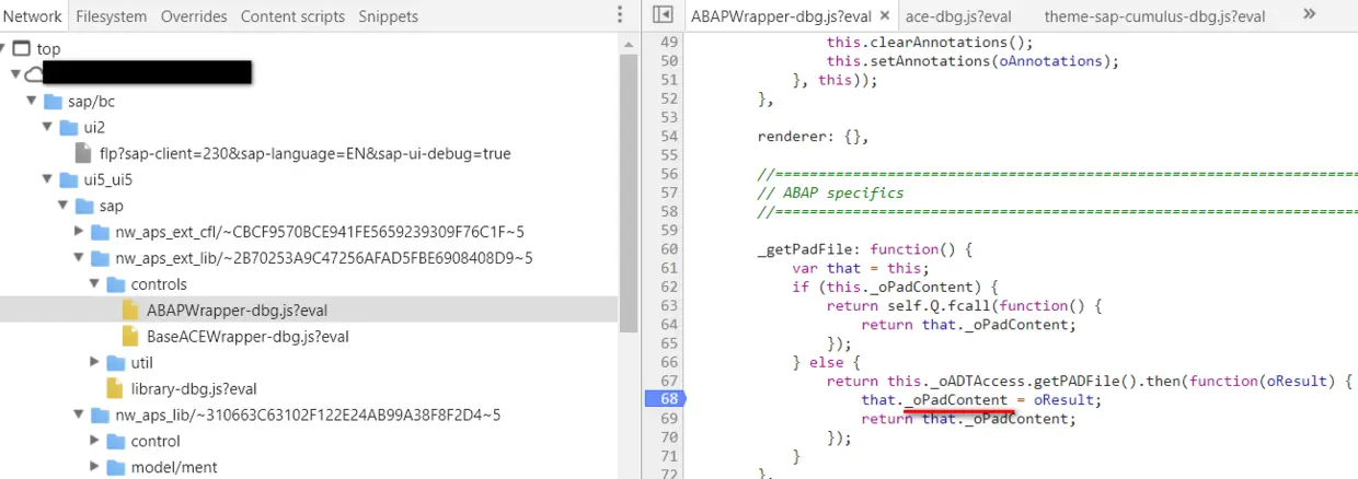 打开ABAPWrapper-dbg.js, 在第68行设置断点。这个函数负责从ABAP后台取PAD文件,该文件和语法高亮有关。