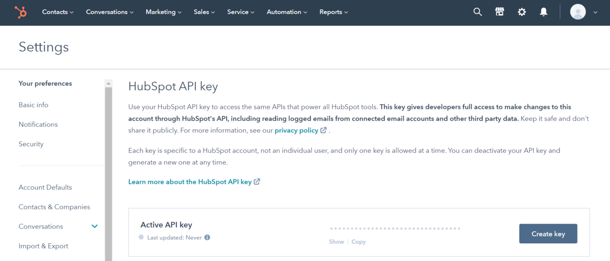 我们把hubspot这个SaaS CRM作为第三方系统,首先登录hubspot,创建一个新的API key: