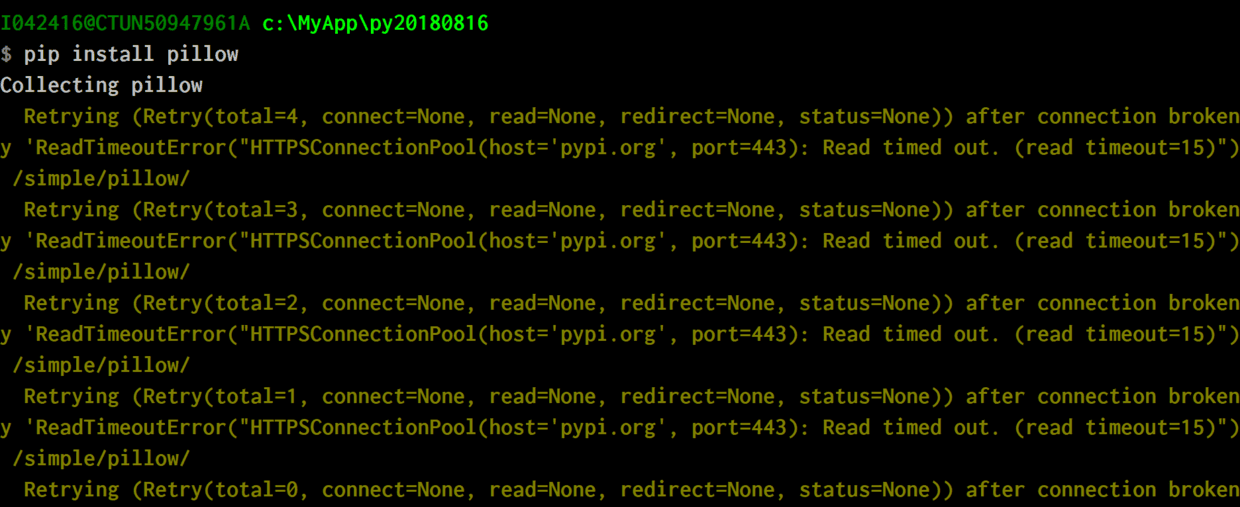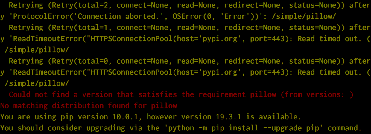 Retrying (Retry(total-1, connect=None, read=None, redirect=None, status-None)) aftery 'ReadTimeoutError("HTTPSConnectionPool(host='pypi.org', port=443): Read timed out./simple/pillow/