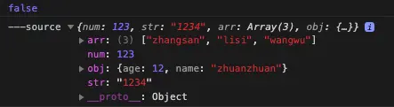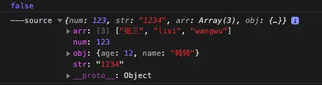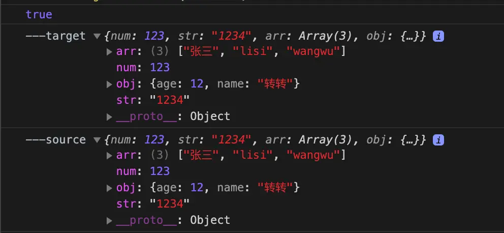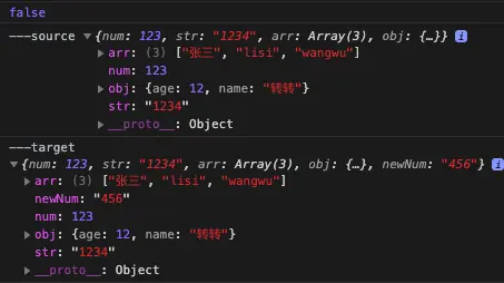 console.log('---source', source);代码中直接将源对象赋值给目标对象,并修改目标对象的数组和对象的某一元素和属性值。下面是打印的日志: