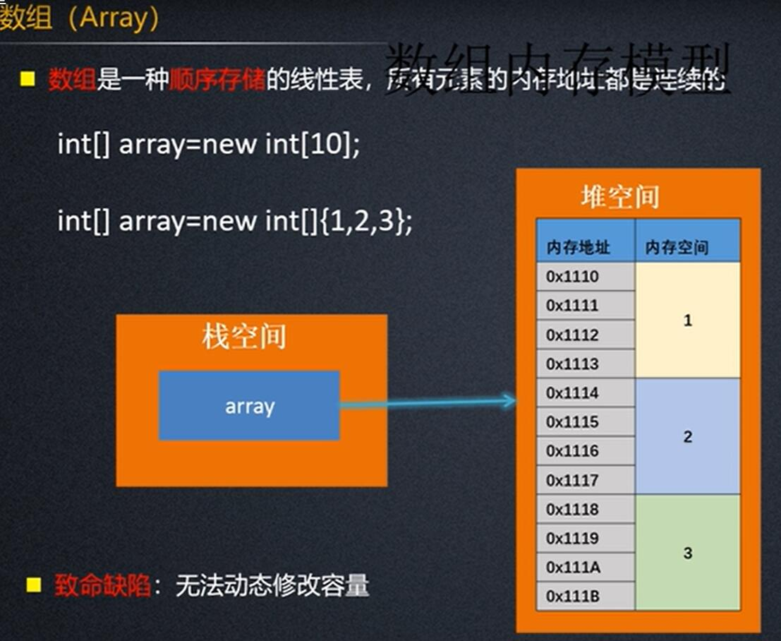 数组的缺点是每个元素之间不能有间隔,当数组大小不满足时需要增加存储能力,就要将已经有数组的数据复制到新的存储空间中。