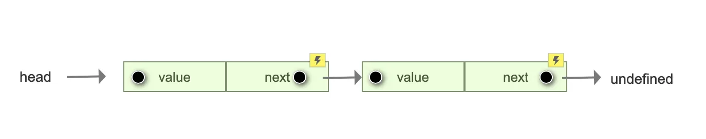 链表数据结构如下,每个元素有 value和next 两个属性,可以通过 next 来指定下一个元素,所以相比与数组这类的数据结构优势在于能够灵活地插入或移除元素而不用遍历数组每项。