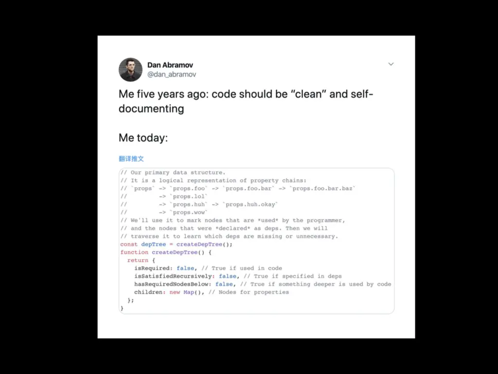Dan 的 Twitter 截图,关于自己对「代码注释」看法的转变。