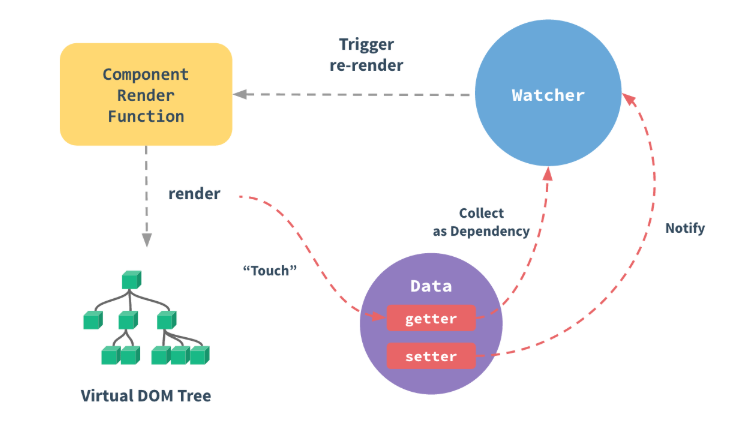 当 Vue Component render 函数被执行的时候, data 上会被 触碰(touch), 即被读, getter 方法会被调用, 此时 Vue 会去记录此 Vue component 所依赖的所有 data。(这一过程被称为依赖收集)