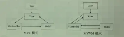 MVC模式,数据是单向的,由view->Controller->Model->View方向循环,而在MVVM模式中,数据是可以双向通信,核心是ViewModel对象。