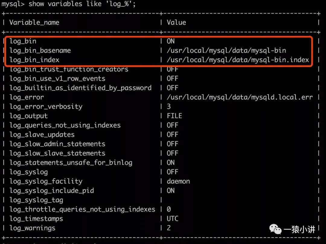 show variables like 'log_%';第二步:开启 MySQL binlog 日志