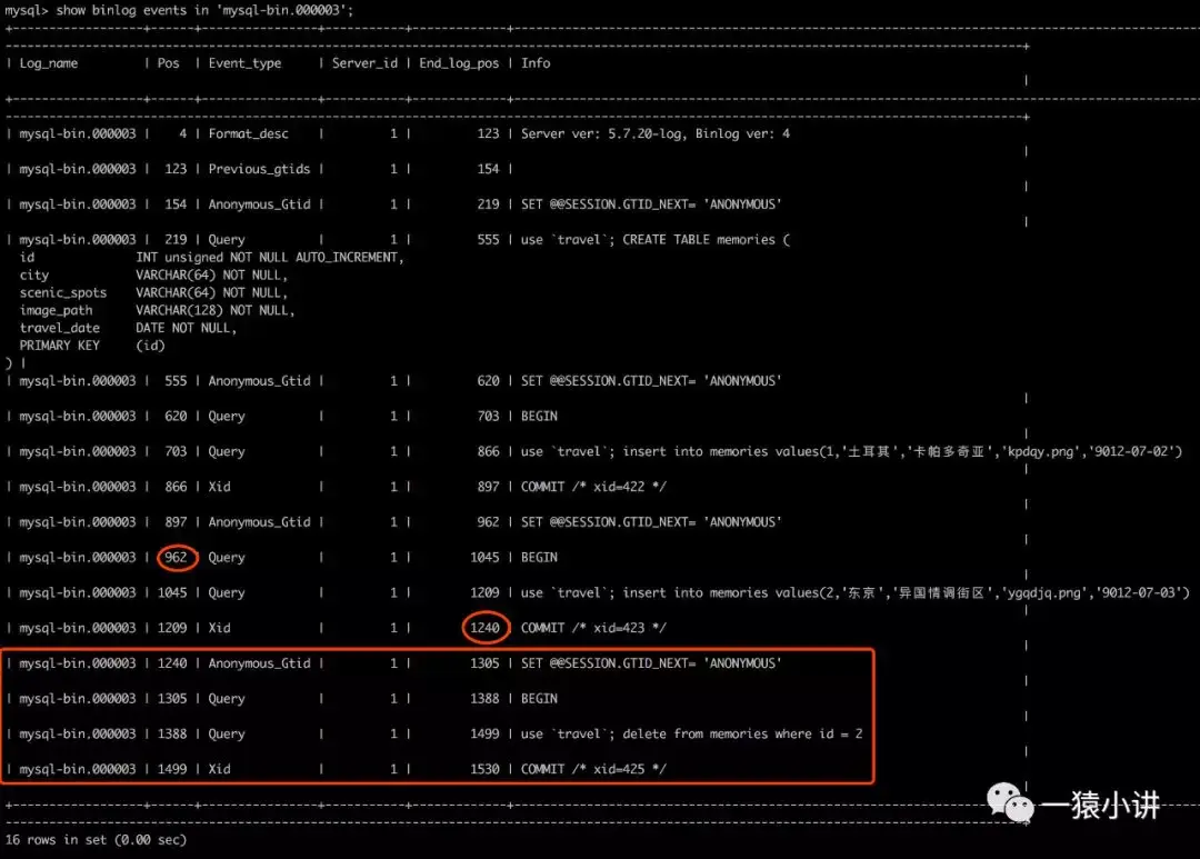 show binlog events in 'mysql-bin.000003';确诊:从 binlog 的事件中可以看断出执行 Python 菇凉执行 delete from memories 语句前的 position 节点为 1240,所以恢复开始的 pos 节点为 962,停止的 pos 节点为 1240 。
