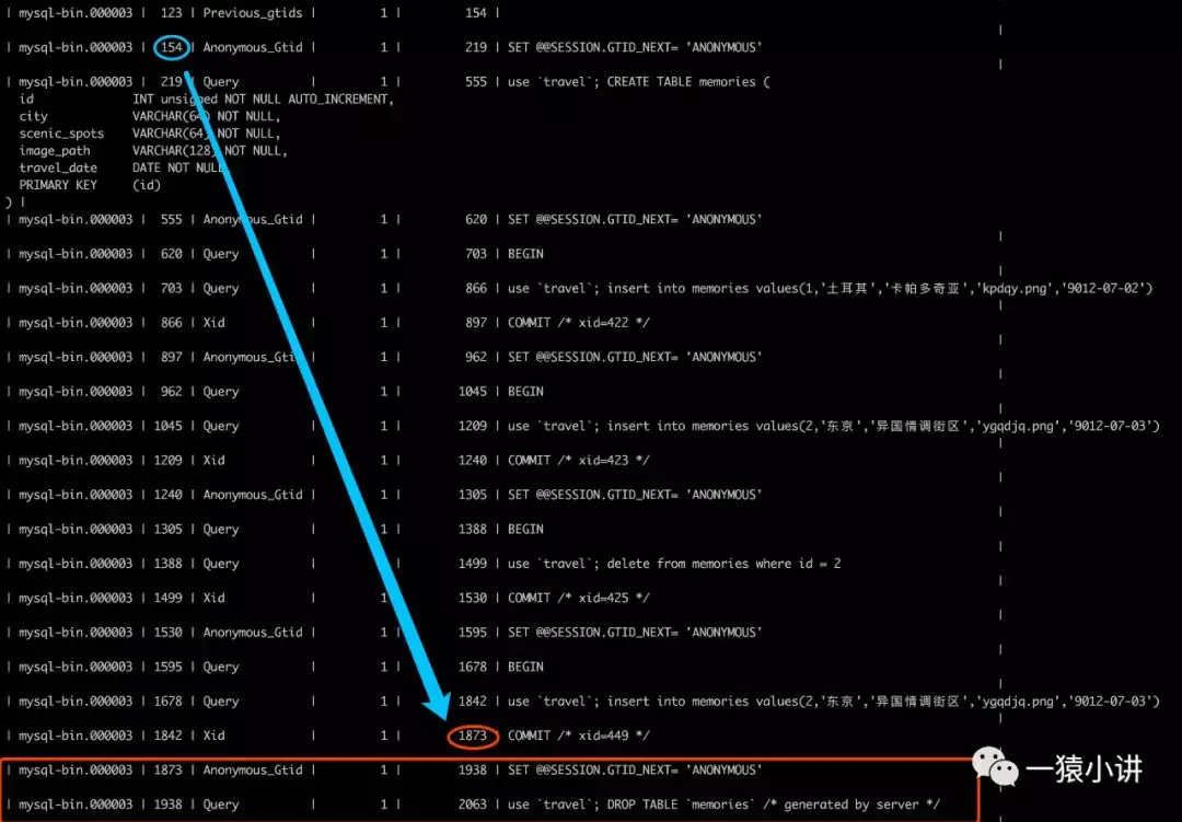 show binlog events in 'mysql-bin.000003';确诊:从 binlog 的事件中可以看断出执行 Python 菇凉执行 drop table memories 语句前的 position 节点为 1873,所以恢复开始的 pos 节点为 154,停止的 pos 节点为 1873 。