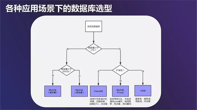 对于关系型数据库的选型来说,可以从数据量和扩展性两个维度考虑,再根据数据库有没有冷备、要不要使用 Toku 存储引擎,要不要使用 Proxy 等等进行抉择。
