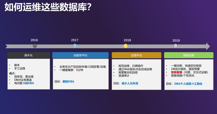 爱奇艺数据库种类较多,如何高效地运维和管理这些数据库也是经历了不同的阶段。