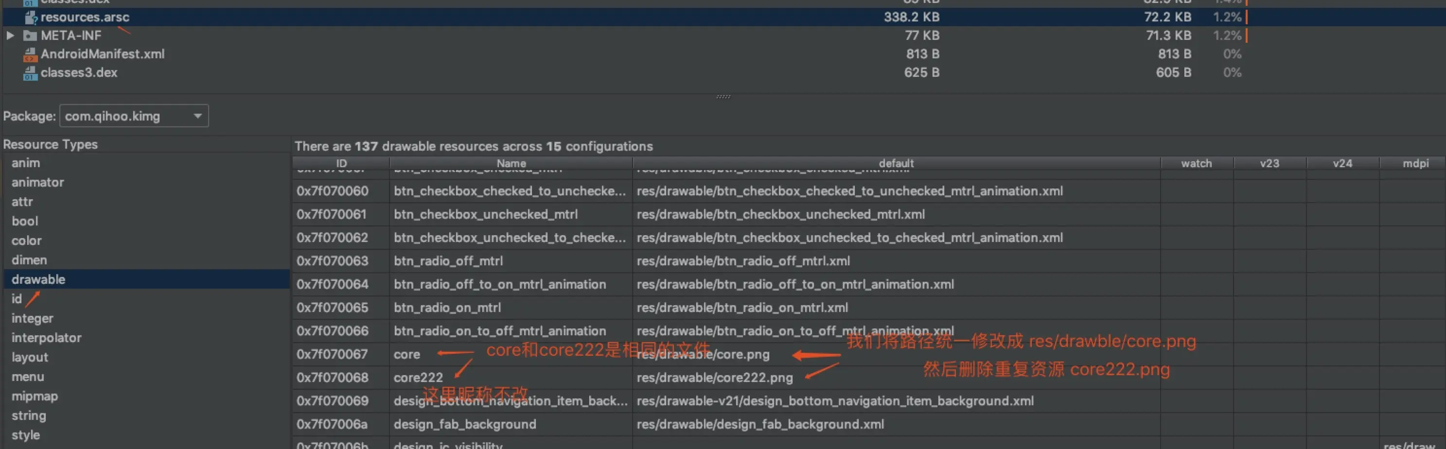 resources.arsc,把这些重复的资源都重定向到同一个文件上.