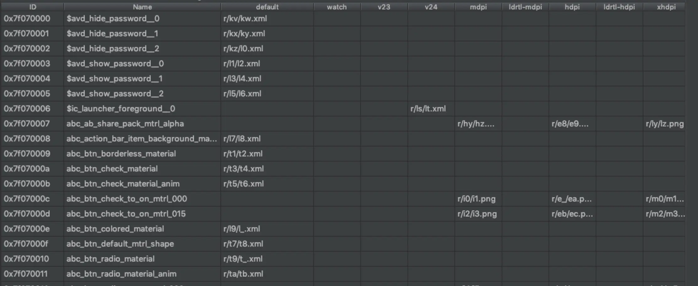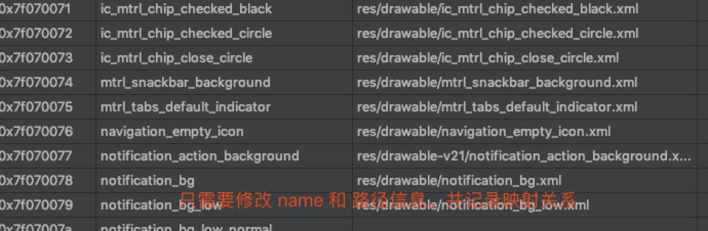 resources.arsc记录了文件的信息,包括R类的id信息,以及文件路径。我们删除了res中重复的资源,哪我们也要将resources.arsc重复的信息,修改绑定到唯一留下的重复文件,不然代码中使用的重复资源就会出现找不到的情况。