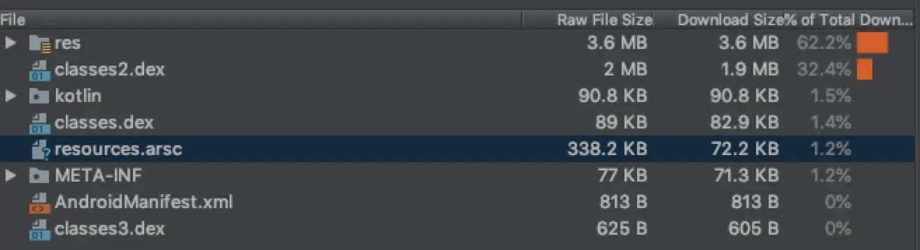 从图片可以看到一个项目的 res 占很大一部分内存,其次就是 dex 文件。所以优化 Apk 的体积就应该从 res 丶 dex 出发。