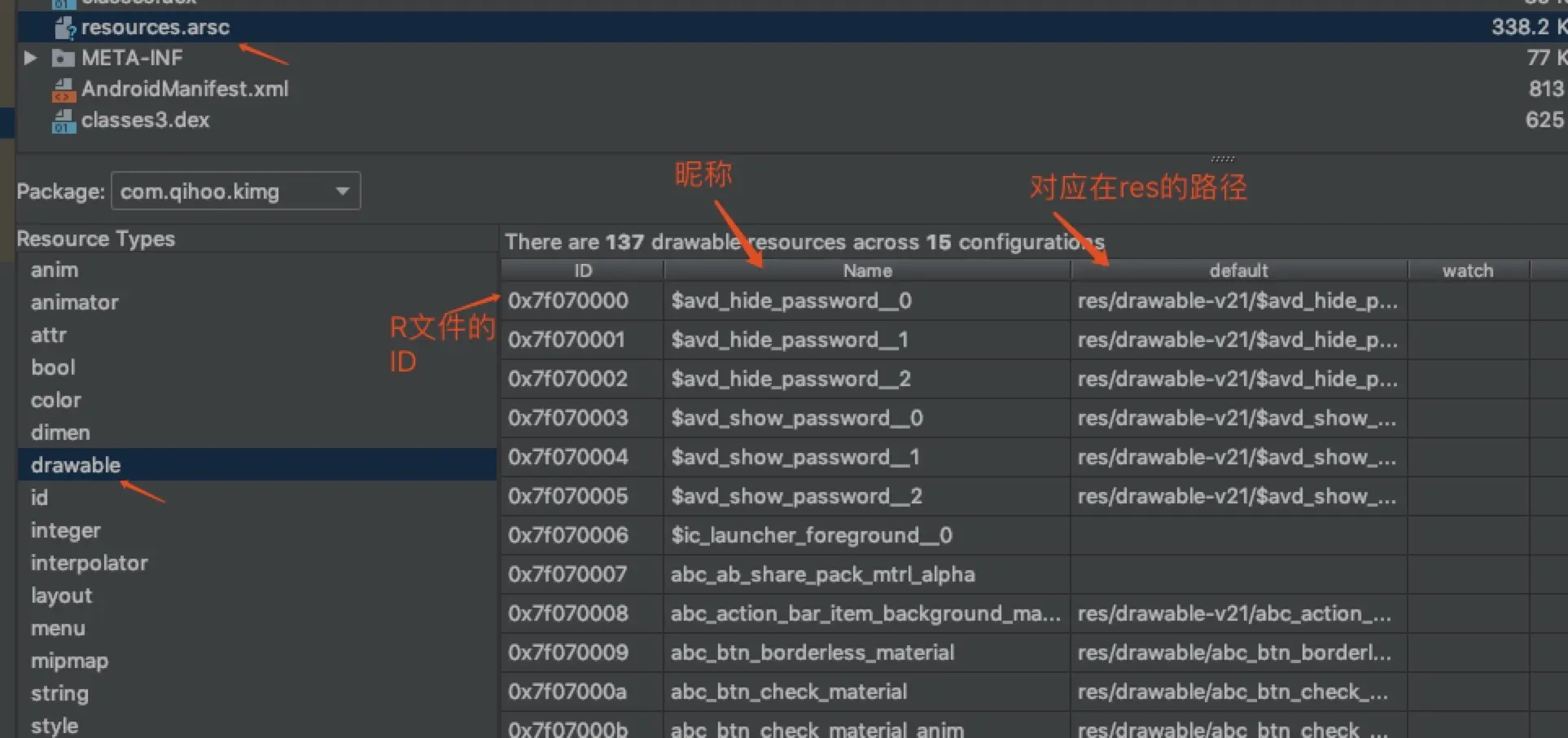 | resources.arsc | 通过 AAPT 编译资源生成的产物,主要存放资源 ID (R 类生成的 ID )和 res 目录下的资源文件对应关系 |