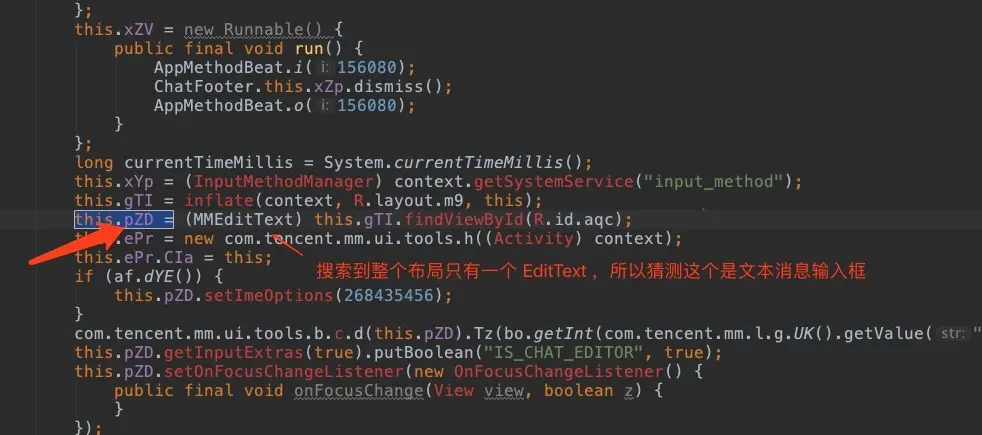 EditText对象,本来还需要通过递归查找发送按钮的View对象,这样效率有点低,但是突然我想到了输入框,按回车也能发消息,因此从新去看了下微信代码,如下图: