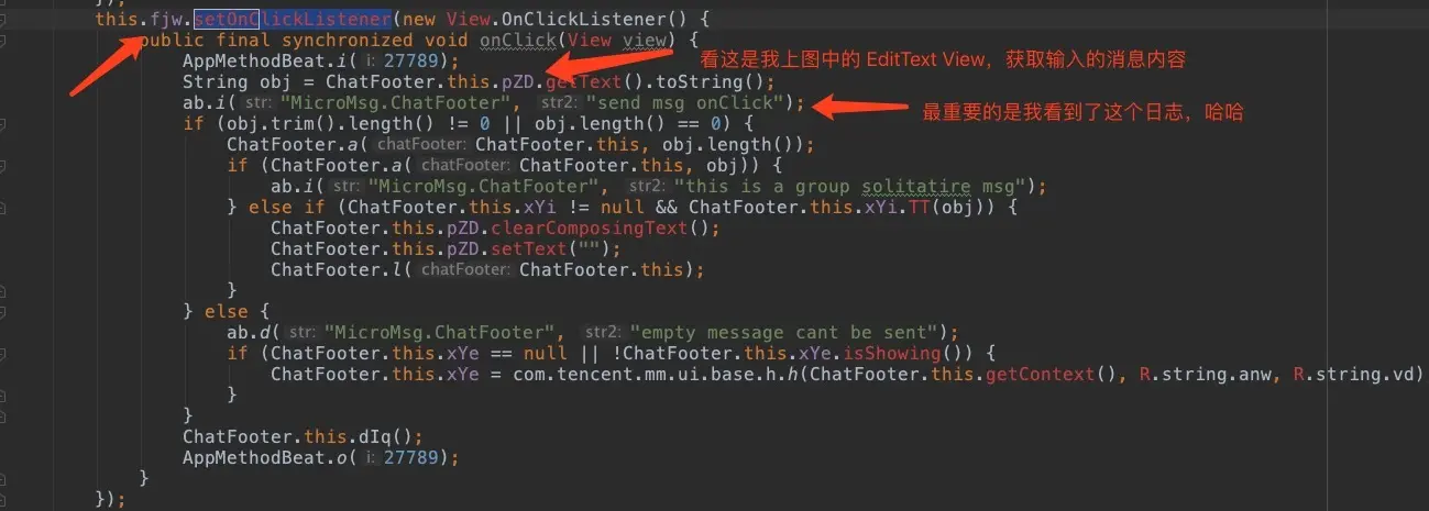 接下来寻找发送消息按钮,我是通过搜索 setOnClickListener 方法,搜索到的。