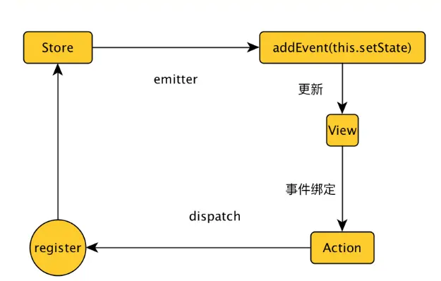 抽离所有的数据处理, 全部放到Store里. 在Store里,进行Dispatcher 的 register. 实现Actions和Store的连接. 设置Store 需要进行页面更新的自定义事件.