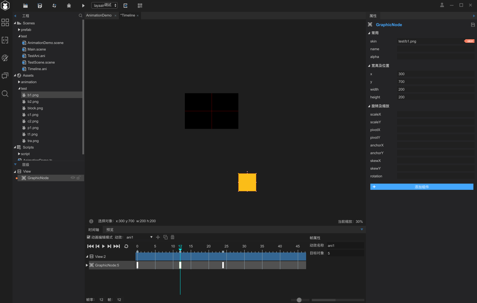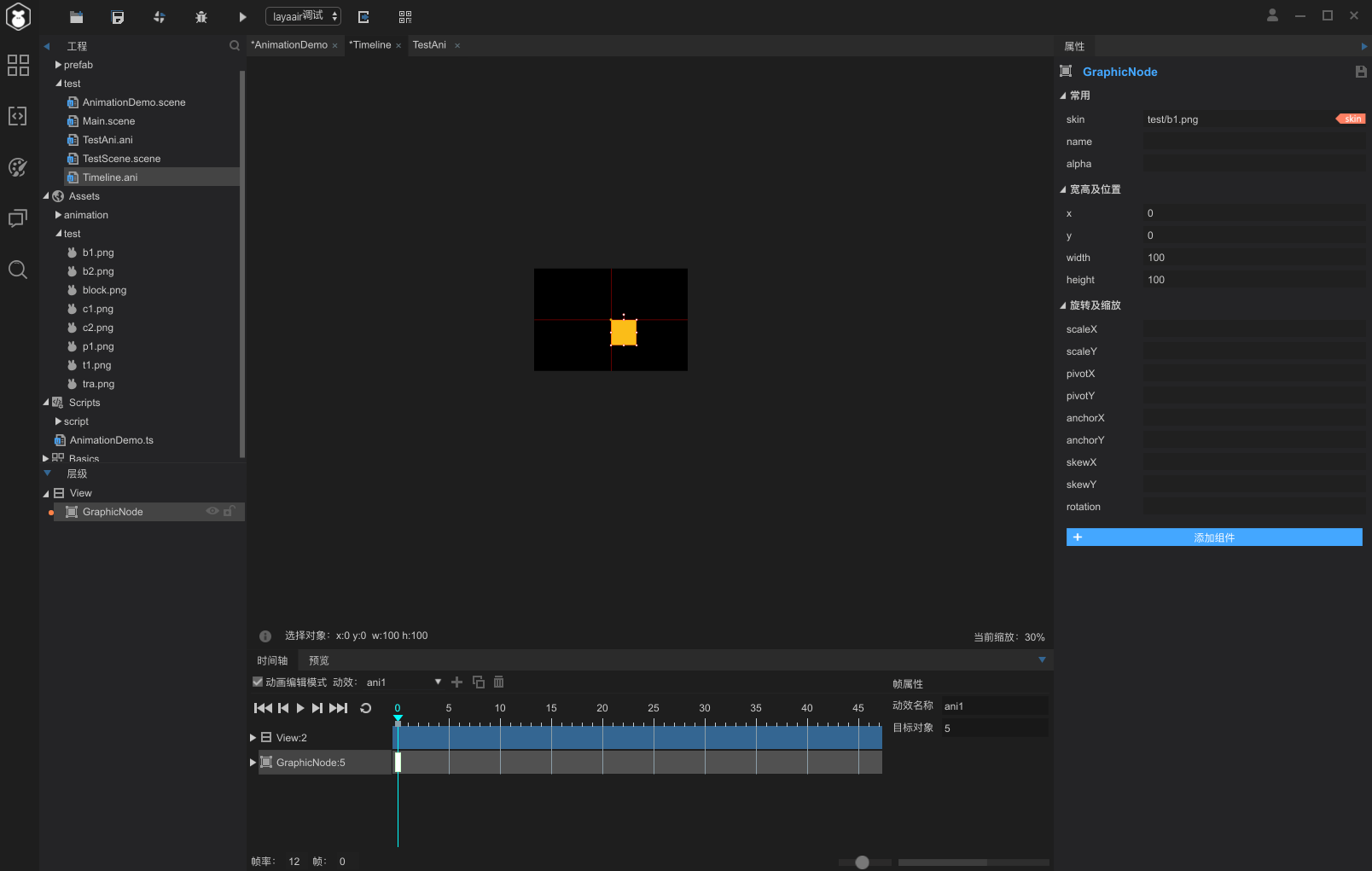 Laya提供了2种方式实现时间轴动画,一是利用IDE的编辑模式创建时间轴动画,二是利用代码直接创建时间轴动画。我们来看一下如何实现一个方块移动且改变大小:
