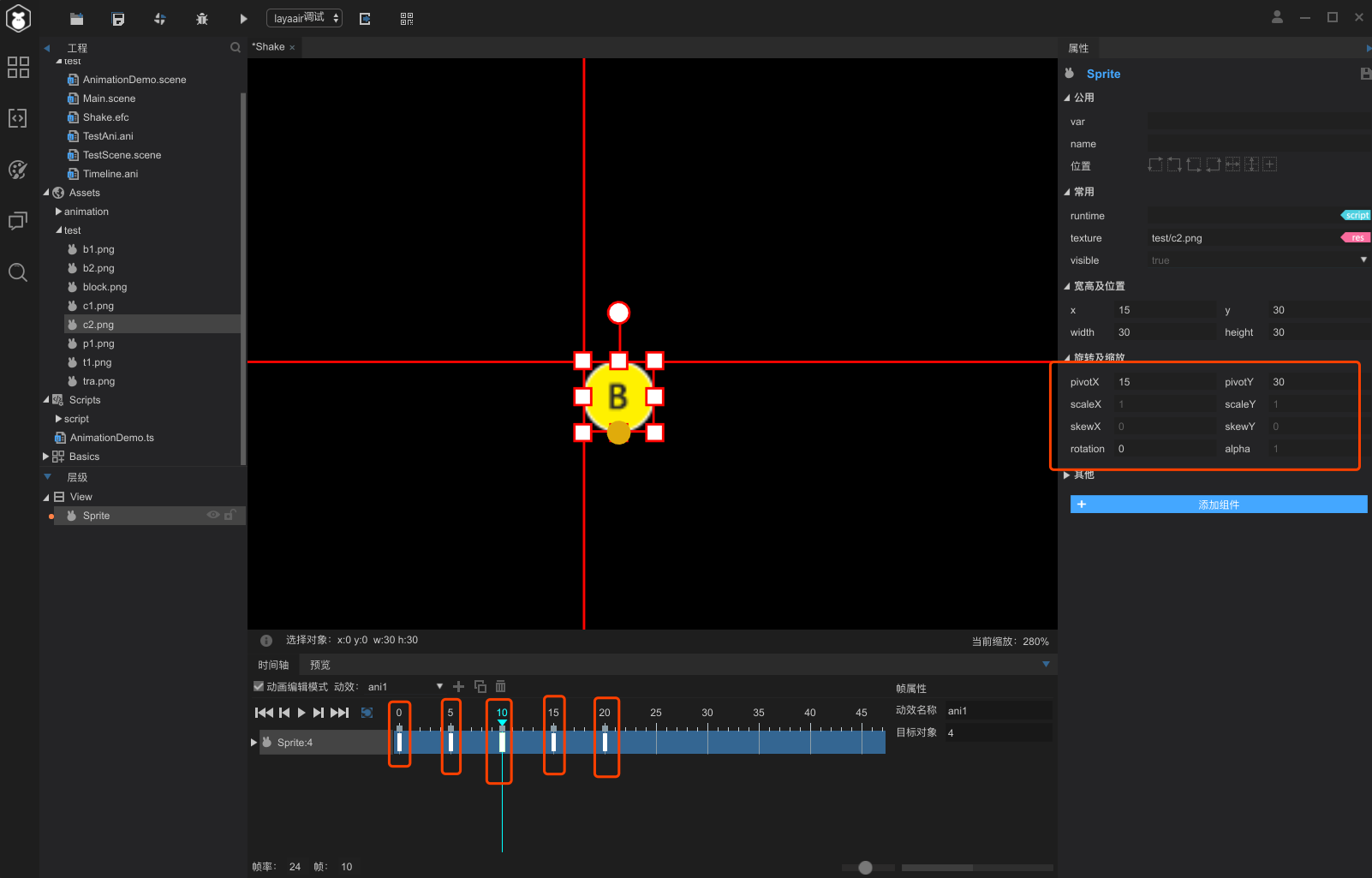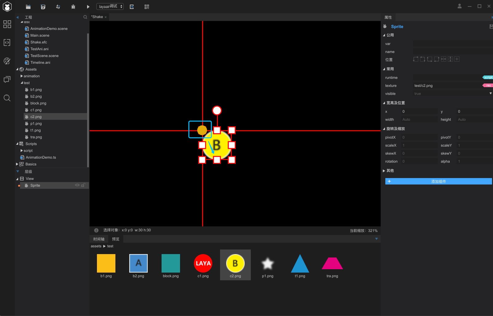 时间轴动画:它可以说是Laya游戏开发中最常用的功能之一,初学者可以把它理解成多个缓动动画和图集动画的集合。在LayaIDE中还提供了时间轴动画编辑器,可以通过编辑时间轴上的每一个关键帧快速实现图片替换、位移、渐变、缩放等动画效果;