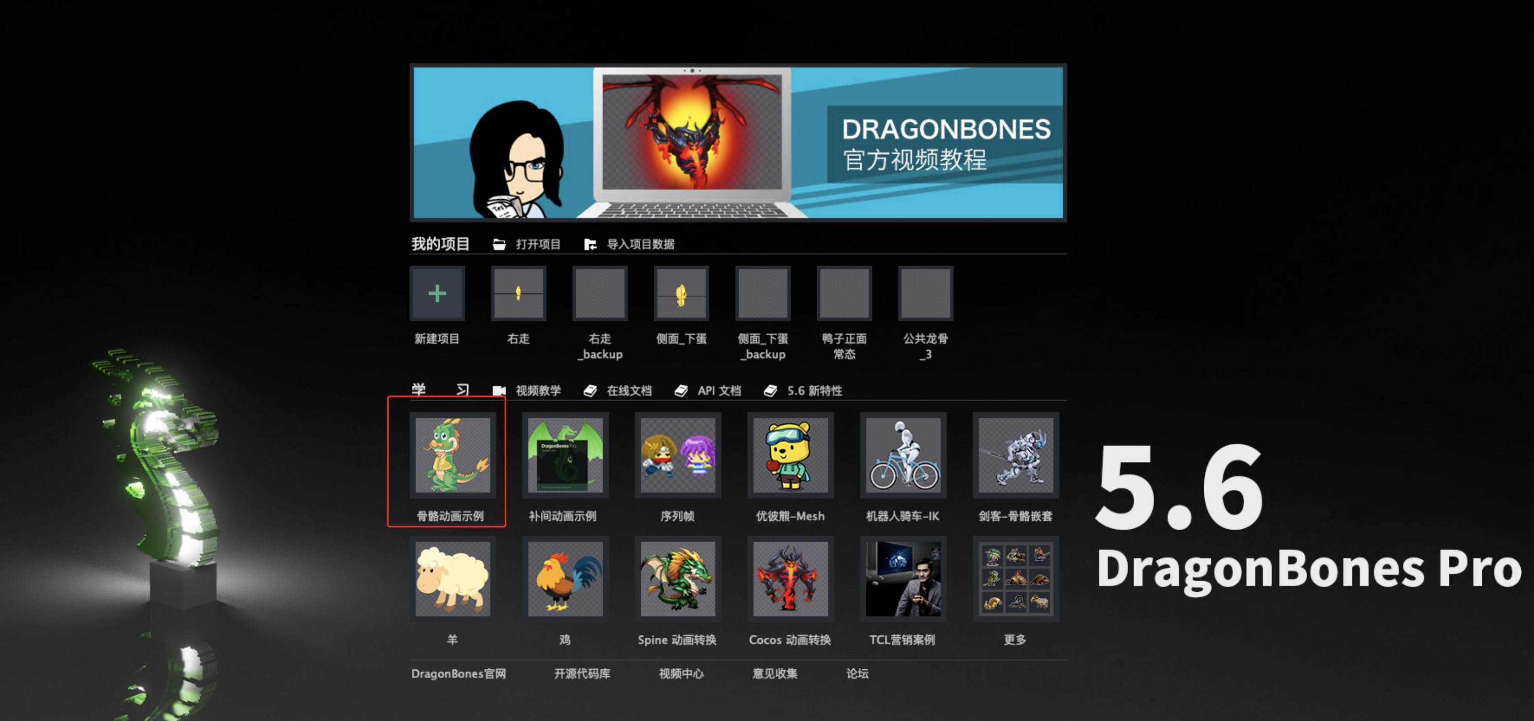 (b) 打开DragonBone工具后随便选择一个骨骼动画的示例,如果你有自己的龙骨动画资源也可以用自己的,这里为了方便就选了第一个资源。